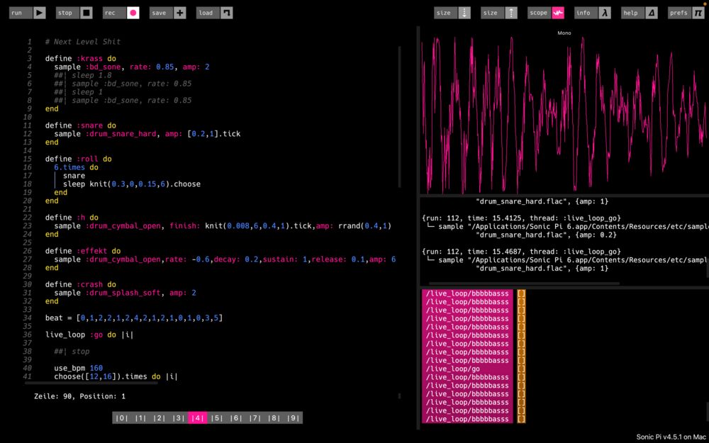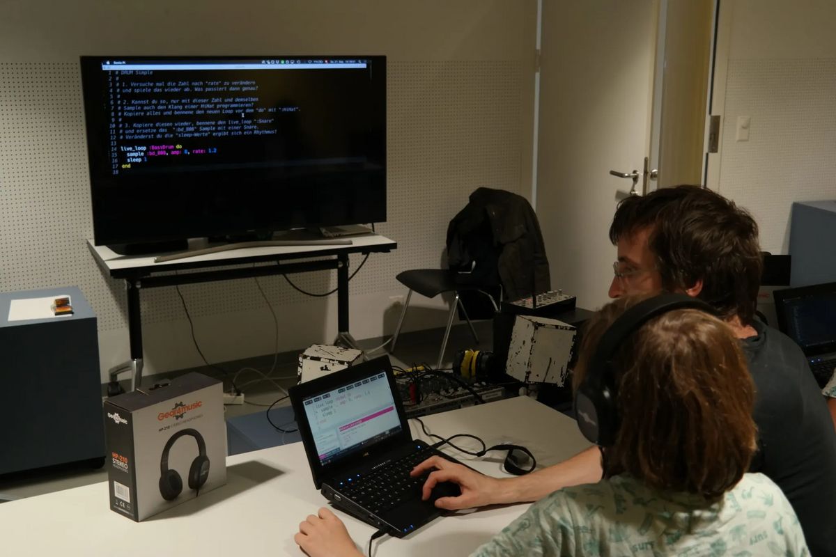 Mit der Software Sonic-Pi wird das Erzeugen von Klängen und Musik über das Schreiben von Programmcode in der Programiersprache Ruby in Echtzeit erreicht. Dabei wird der Computer in ein Musikinstrument verwandelt, welches wiederrum im Gegensatz zu üblicher musikalischer Arbeit am Computer live und in kleinen Gruppen zusammen gespielt wird!