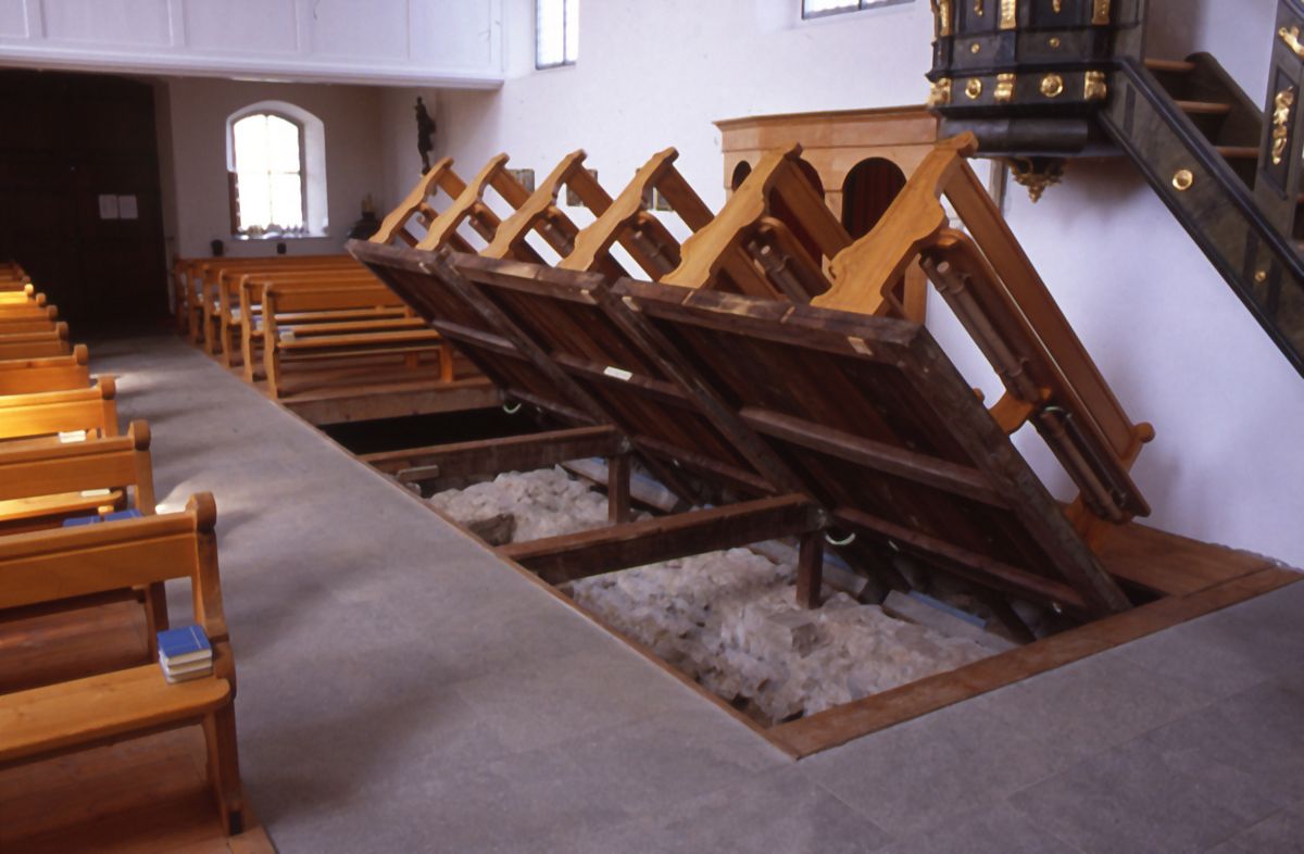 Unter den Kirchenbänken der Alten Pfarrkirche St. Maria und Ulrich verbirgt sich viel Geschichte. Bereits 1951 kamen bei Ausgrabungen Überreste älterer Sakralbauten und eines römischen Gutshofs zum Vorschein. Zwei später entdeckte römische Brandgräber und frühmittelalterliche Grubenhäuser in der nahen Umgebung ergänzen das eindrucksvolle Bild einer kontinuierlichen Besiedlung über viele Jahrhunderte. Neue Informationstafeln vor der Kirche vermitteln spannende Einblicke in die Geschichte dieses bedeutenden Ortes. Klappen Sie die Kirchenbänke hoch und werfen Sie einen direkten Blick auf die archäologischen Spuren!